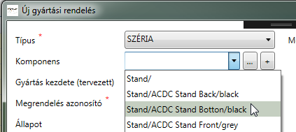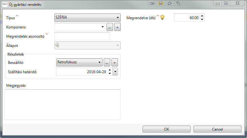 A Megrendelés azonosító mező automatikusan kitöltésre kerül a kiválasztott Komponens alapján, de szerkeszthető.