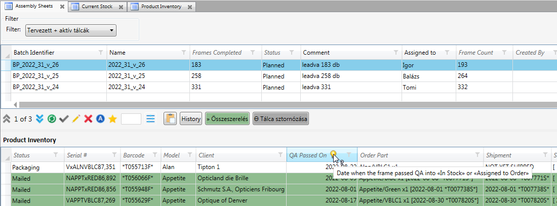 - [Csilla] Product Inventory now shows "QA Passed On" column both on the Product Inventory as well as Assembly Sheets views: